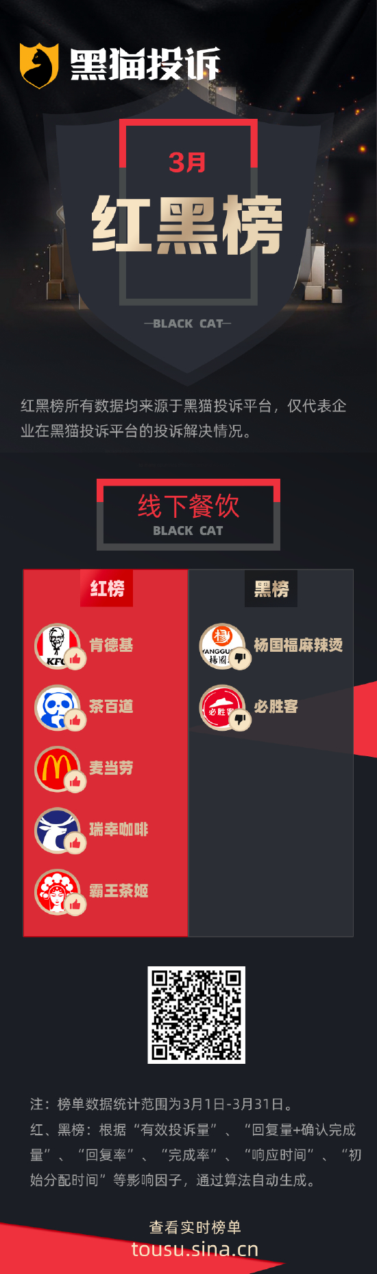 3月黑猫投诉线下餐饮领域红黑榜:杨国福麻辣烫外卖吃出异物
