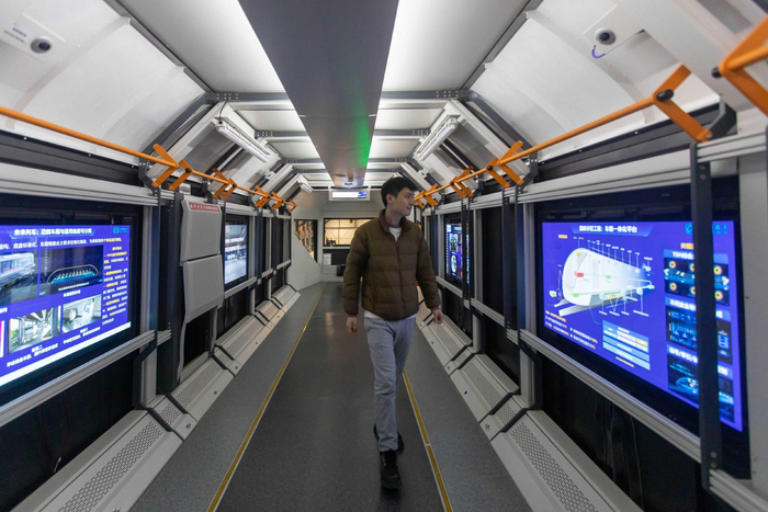 “这是一台公司自主研发的虚拟连挂智能列车。”王伟介绍,列车采用自主虚拟编组控制系统,在高峰时期可以进行连挂从而满足大流量旅客的需求,提升整体运力。在平峰期时,运力需求没有那么强大,就可以将长编组变为短编组,例如六节的车厢变为三节,既节能又省力。对于一干多支的情况,在分岔口时可以根据旅客的乘坐需求,分为两支短编组同时运行,避免乘客多绕路的情况。此外,还可以连挂运货车厢进行独立货运,既节省了成本又提升了整体利用率。”