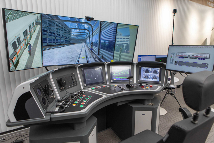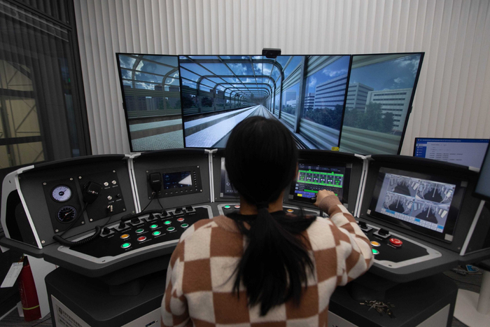 在关注交通信号技术发展之余,交控科技还聚焦城轨列车人员培训,打造了“城市轨道交通综合培训中心”。中心有一台司机模拟驾驶器,工作人员张艳春正在进行设备的日常调试与维护,在教员考评系统中,注入不同系统的故障及突发事件等场景,用于列车司机的专项培训和技能鉴定。