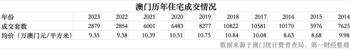 本次“撤辣”政策出台的背景是澳门楼市的低迷。澳门统计暨普查局的数据显示,2016年~2018年,澳门住宅的年度成交量都在1万套左右,房价也处于快速上涨阶段,从8.63万澳门元/平方米上涨至10.84万澳门元/平方米。2019年开始,澳门住宅成交量和价格均进入下行通道,2023年成交量仅2879套,较2018年下降了73%,房价也跌至9.35万澳门元/平方米,相较2018年的高峰期跌了13.7%。