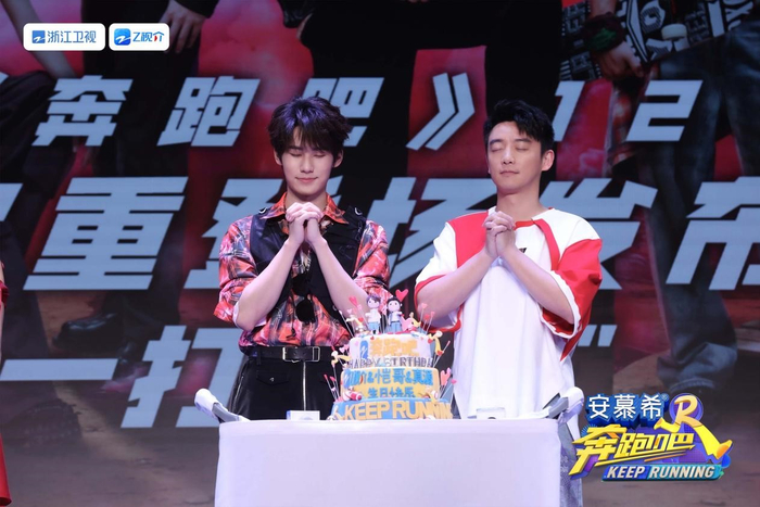 “兄弟团”成员郑恺(右)和张真源在发布会现场庆生。