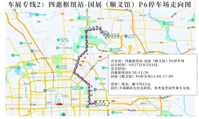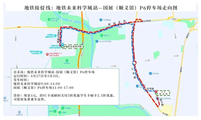 4月27日至5月4日,开通1条地铁未来科学城站至国展(顺义馆)P6停车场的地铁接驳线。乘坐地铁17号线的乘客可换乘公交前往观展。