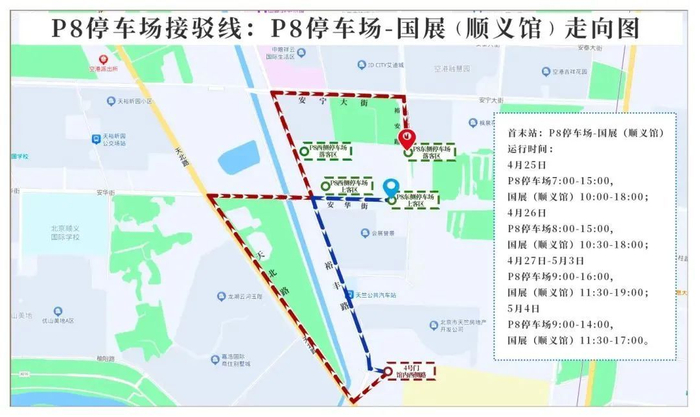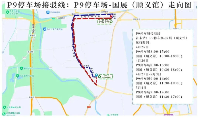 4月25日至5月4日,开通P8停车场至国展(顺义馆)、P9停车场至国展(顺义馆)的2条停车场接驳线。自驾的乘客可免费乘车前往观展。