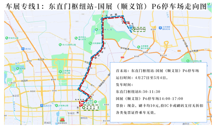 发车时间:东直门枢纽站8:30-11:30,国展(顺义馆)P6停车场14:00-17:00。
