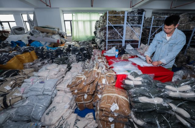 2023年11月8日,在位于织里镇的湖州慕橙服饰有限公司库房内,工作人员根据网络订单打包童装。新华社图