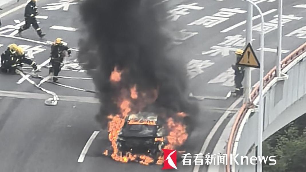 目击市民介绍,事故发生在南浦大桥浦东往浦西方向下引桥处。事故发生时,一辆悬挂新能源号牌的轿车停在东向西下引桥的最右侧车道上,车辆驾驶室及后排有明火燃烧,现场浓烟滚滚,驾驶员下车后拨打报警电话。途经车辆驾驶员纷纷向左变道,驾车快速驶离现场。由于火势蔓延速度较快,很快起火车辆就陷入一片火海。