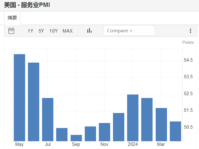 值得注意的是,美国经济降温的迹象仍在继续,标普全球美国4月制造业采购经理人指数(PMI)重新回到荣枯线以下,服务业PMI从3月份的54.0降至本月50.9的五个月低点。