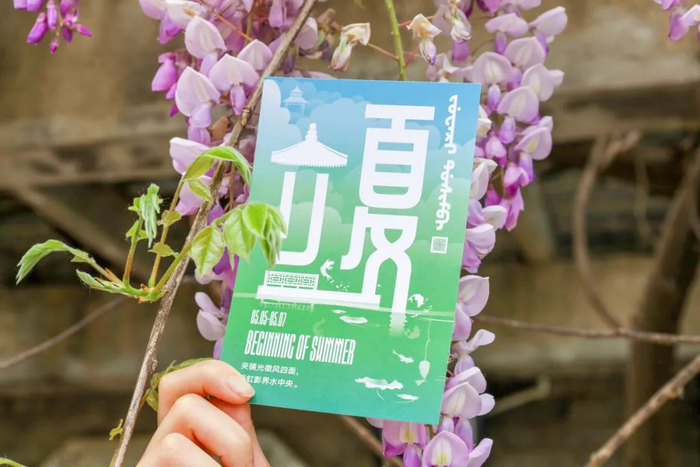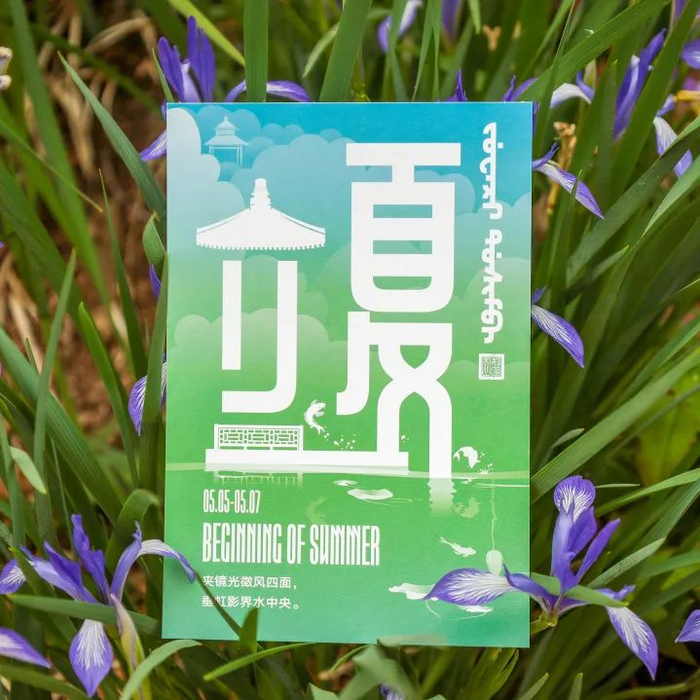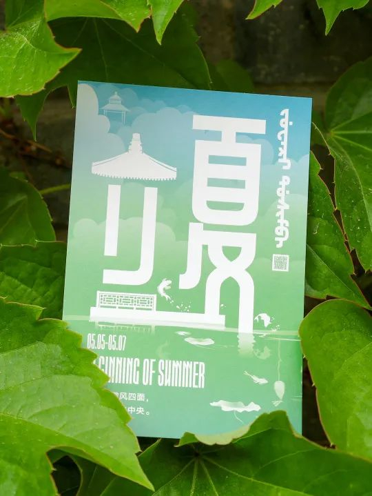 在今天香山公园继续推出二十四节气系列明信片之立夏款。明信片整体采用初夏绿意盎然的色调,将见心斋景区巧妙融合其中,“立”字上方由见心斋知鱼亭的建筑结构构成,下方延伸出水榭围栏,活泼的锦鲤有的自由游弋、有的跃出水面,带给大家“鱼跃龙门”的美好寓意和畅快欢愉的初夏氛围。