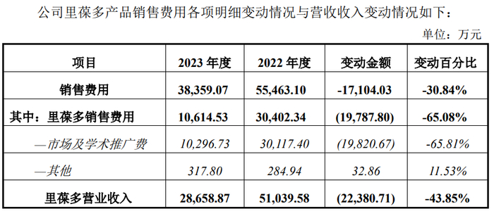 2023年,里葆多的销售费用率从2022年的59.57%下降到37.04%,随之而来的是销售量的暴跌。复旦张江称,2023 年下半年起,由于上海辉正推广不力,里葆多销售未达预期,导致公司第三、四季度的销售额较去年同期下降明显,全年销售额较去年同期下降43.85%。