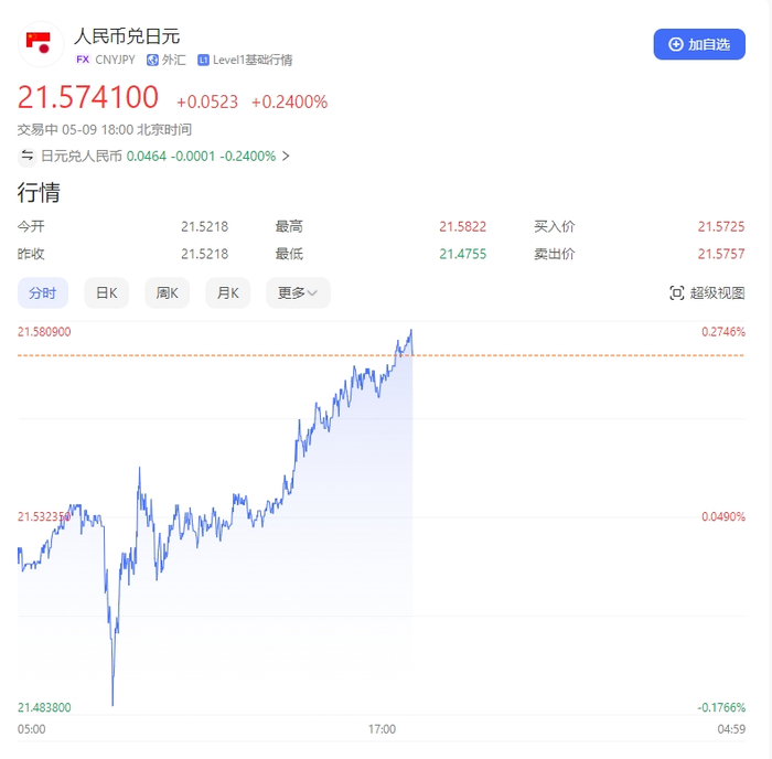 截至5月9日18时,人民币兑日元汇率徘徊在21.57附近,离4月29日创下的近年最高点21.97仅有一步之遥。