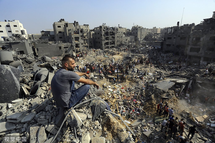 当地时间2023年11月1日,加沙地带北部贾巴利亚难民营,以色列对当地发动空袭,一名男子坐在废墟上,其他人在空袭的建筑物残骸中徘徊。(图源:视觉中国)