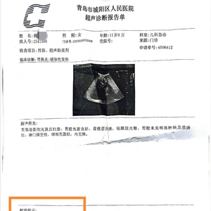 2023年11月20日,魏永彤女儿就诊第二日的腹部彩超诊断报告单。 受访者供图