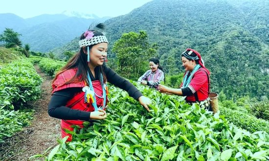 茶厂里人头攒动、欢声笑语,珞巴族女子穿梭在茶树之间,单手轻轻一旋,嫩叶飘然入篓,不一会儿,篓里已是一片青绿。