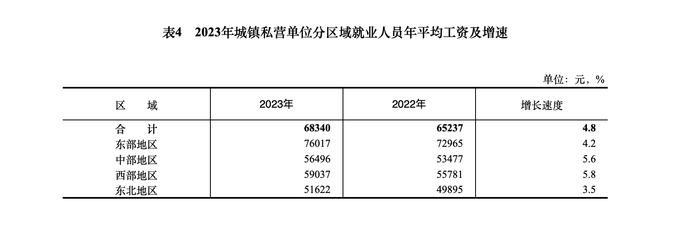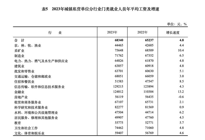 2023年,全国城镇私营单位就业人员年平均工资为68340元,比上年增加3103元,名义增长4.8%,扣除价格因素实际增长4.5%。