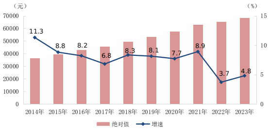图1 2014-2023年城镇非私营单位就业人员年平均工资及增速