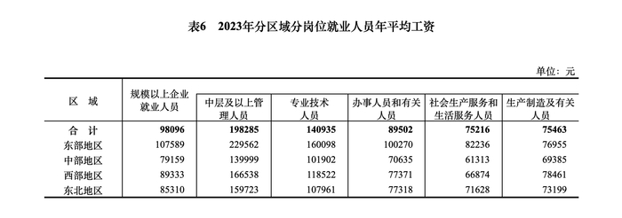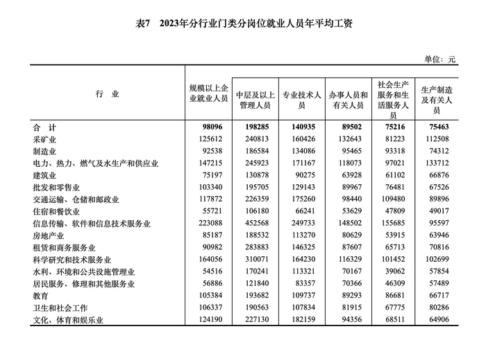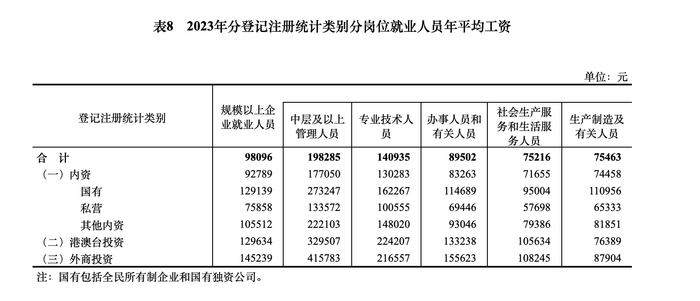 新京报讯 据国家统计局网站消息,2023年,全国城镇非私营单位和私营单位就业人员年平均工资分别为120698元和68340元;规模以上企业就业人员年平均工资为98096元,其中中层及以上管理人员198285元,专业技术人员140935元,办事人员和有关人员89502元,社会生产服务和生活服务人员75216元,生产制造及有关人员75463元。
