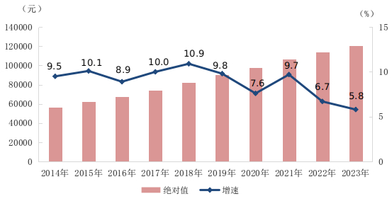 2023年,全国城镇非私营单位就业人员年平均工资为120698元,比上年增加6669元,名义增长[1]5.8%,扣除价格因素实际增长5.5%。