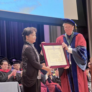 毕业典礼现场,林徽因外孙女于葵代表林徽因,从韦茨曼设计学院院长弗里茨·斯坦纳手中,接过了这份迟到近百年的学位证书。