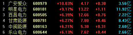 电力板块表现活跃,截至午盘,广安爱众涨停,明星电力、西昌电力、乐山电力等跟涨。