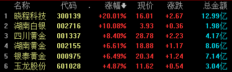 贵金属板块大涨,截至午间收盘,晓程科技、湖南白银涨停,四川黄金、湖南黄金、银泰黄金等涨幅居前。
