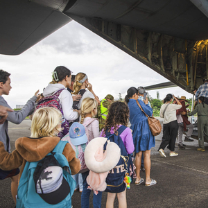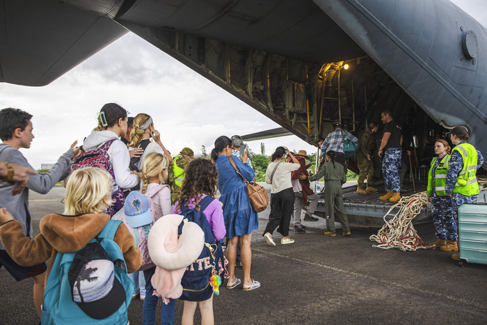 当地时间2024年5月21日,法国努美阿,澳大利亚和其他游客登上澳大利亚空军大力神,准备从新喀里多尼亚努美阿的Magenta机场出发。图源:视觉中国