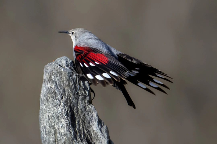红翅旋壁雀是北京市重点保护野生动物,尾短而嘴长,翼具醒目的绯红色斑纹。多生活于非树栖高山型、栖息在悬崖和陡坡壁上以及或栖于亚热带常绿阔叶林和针阔混交林带中的山坡壁上。常在岩崖峭壁上攀爬,两翼轻展显露红色翼斑。