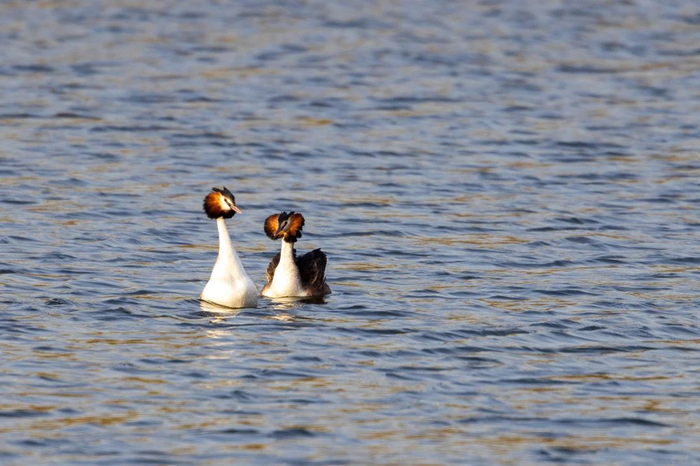 凤头䴙䴘是北京市重点保护野生动物,亦称冠䴙䴘、浪裏白,颈修长,有显著的黑色羽冠。其食物鱼、虾、水生昆虫、部分水生植物。常成对或小群活动。善游泳、潜水,不善飞行。其巢多位于浅水处的水草间。