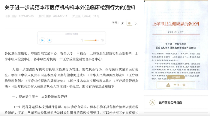 近期,上海市卫健委发布《关于进一步规范本市医疗机构样本外送临床检测行为的通知》(下称《通知》)并明确了要加强外送样本的检测流程管理、严格执行收费政策,并需对第三方检测机构进行质量控制。《通知》的发布再次引发业内关注。