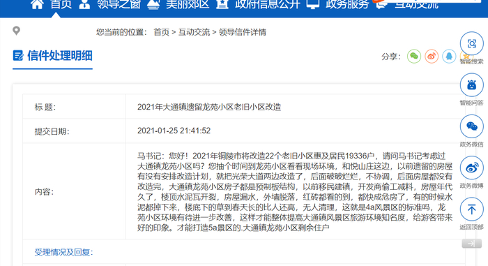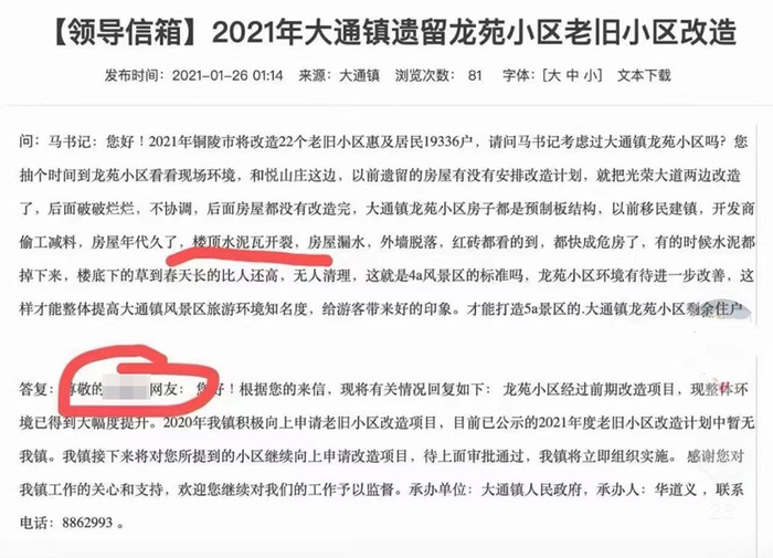 澎湃新闻(www.thepaper.cn)注意到,铜陵市郊区人民政府网站“领导信箱”栏目曾在2021年公开回复过一位龙苑小区居民吴先生的留言,但相关网页内容已在今年5月28日被删除。