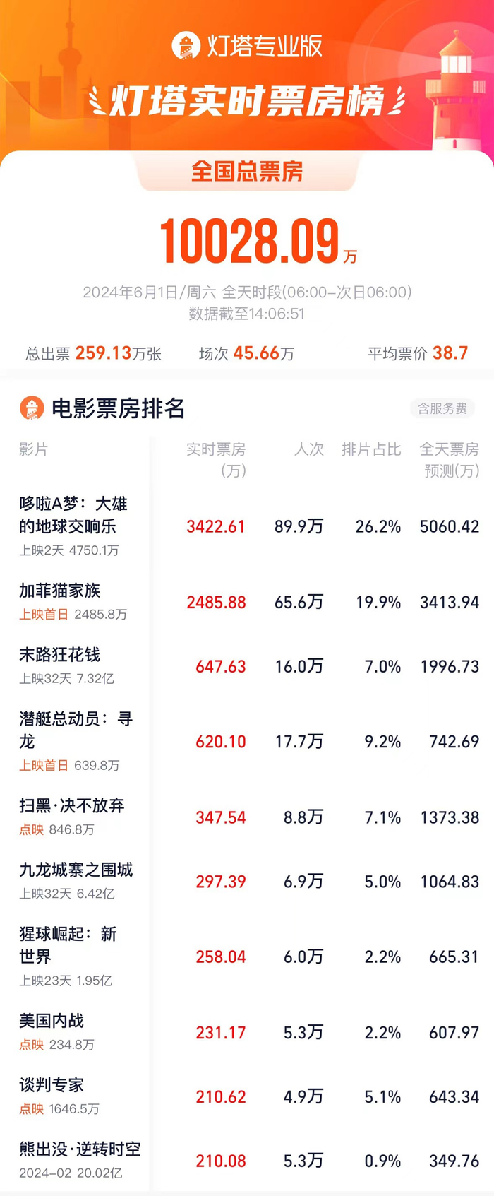 六一儿童节电影票房破亿,《哆啦A梦:大雄的地球交响乐》领跑