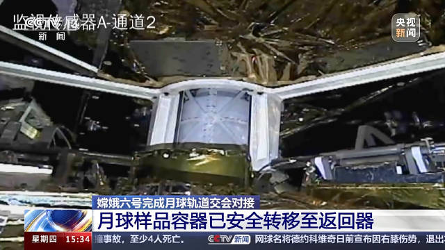 嫦娥六号上升器自6月4日上午从月球背面起飞进入环月飞行轨道后,先后进行了4次轨道调整,上升器于轨道器和返回器组合体前方约50公里,上方约10公里位置时,轨道器和返回器组合体通过近程自主控制逐步靠近上升器,完成轨道交会。轨道器配置的3套K形抱爪对准上升器连接面的3根连杆,通过将抱爪收紧实现两器紧密连接,精准完成交会对接。此后,装载着珍贵月球背面样品的容器从上升器被安全转移至返回器中。