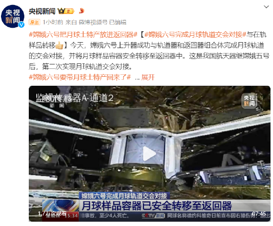 嫦娥六号完成月球轨道交会对接与在轨样品转移