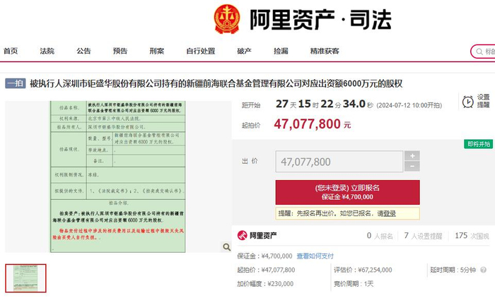 上述股权对应钜盛华6000万元的出资额,评估价为6725.4万元,起拍价为4707.78万元,相当于7折起拍,拍卖时间为7月12日。