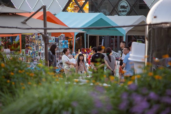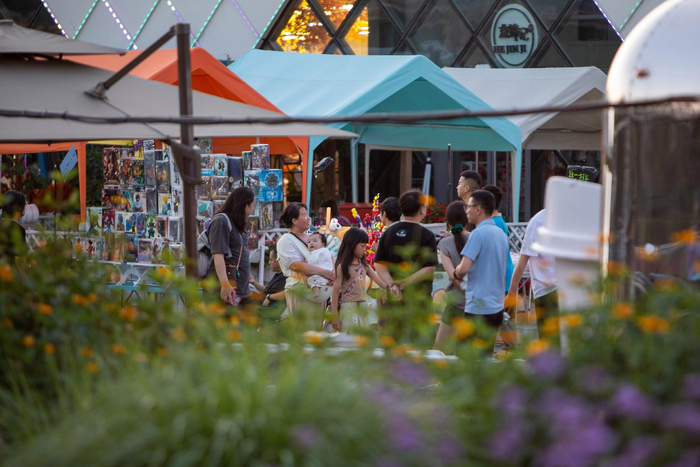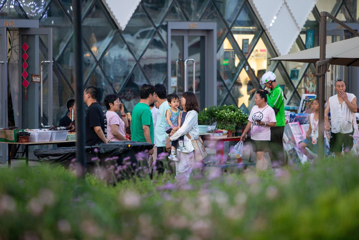 夜市一旁,姹紫嫣红的口袋花园同样游人如织。快到盛夏,大多数花都已凋零,这片花海仍在肆意生长,绣球花、天人菊、柳叶马鞭草……各式小花竞相绽放,为夜市增添了别样景致。“中心门口的这片绿地是花木集团特别设计规划的,可以让消费者‘未进花卉市场,先知蓬勃绿意’,也为夜市顾客提供了一个休闲纳凉的好去处。”周奕说。