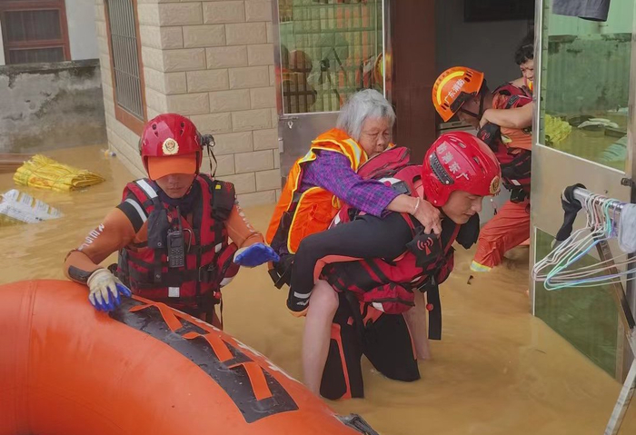 在平远县坝头村,一名六旬老人瘫痪在床无法行动,消防救援人员发现后,立即3人合力将老人抬起,扶到背上后抬送下楼,乘坐橡皮艇快速转移至安全区域。