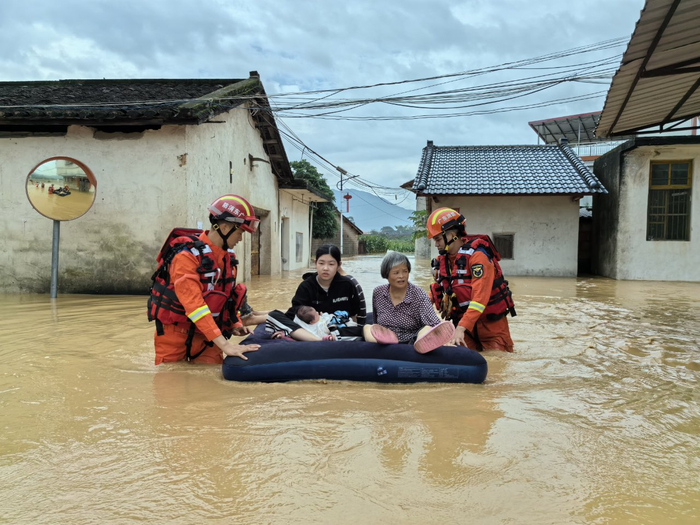 而在蕉岭县文福镇乌土村,一对60余岁的老年夫妇和一个小孩被困在民房二楼。消防人员赶到现场后,立即蹚水过去为其穿上救生衣,将老人扶到船上,迅速转移至安全区域。