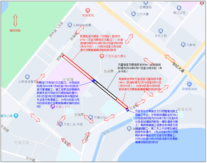 万宝街至万盛街段,封闭时间为7月10日至8月31日;