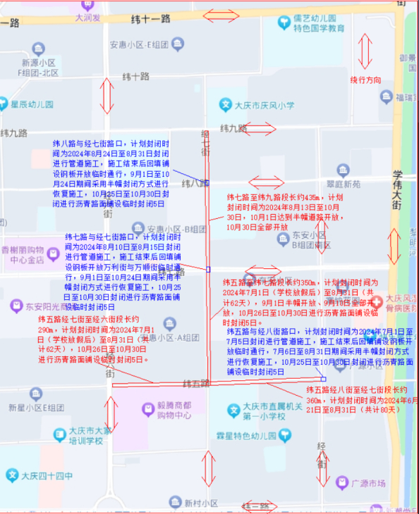 经七街纬五路至纬七路段计划封闭时间为2024年7月1日至8月31日,9月1日半幅开放、9月10日全部开放;
