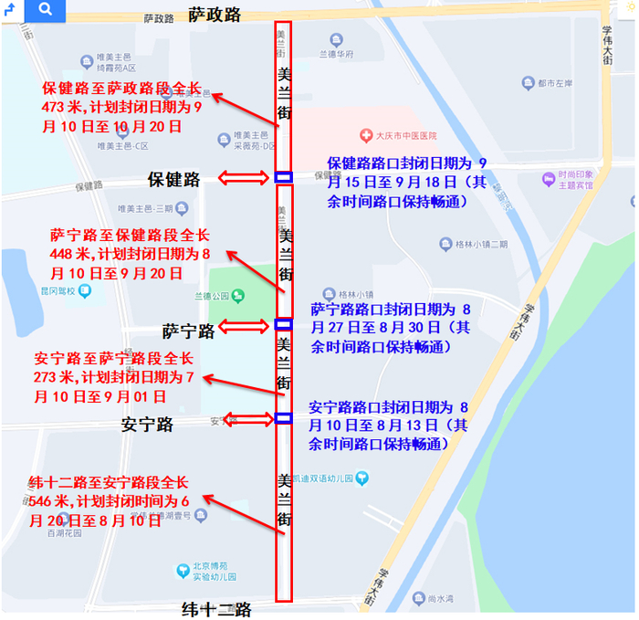 大庆市公安局交通警察支队发布关于美兰街封闭施工公告,详细封闭时间及绕行方案,说明如下: