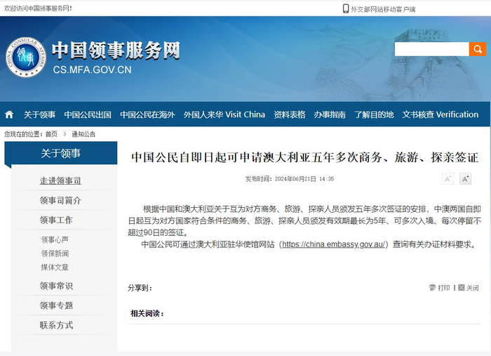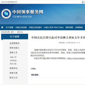 新京报讯 据中国领事服务网消息,根据中国和澳大利亚关于互为对方商务、旅游、探亲人员颁发五年多次签证的安排,中澳两国自即日起互为对方国家符合条件的商务、旅游、探亲人员颁发有效期最长为5年、可多次入境、每次停留不超过90日的签证。