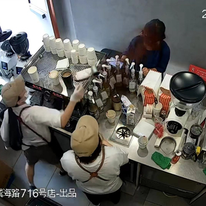 6月17日,Manner Coffee威海路716店一名咖啡师向女顾客泼咖啡粉。图/网络视频截图