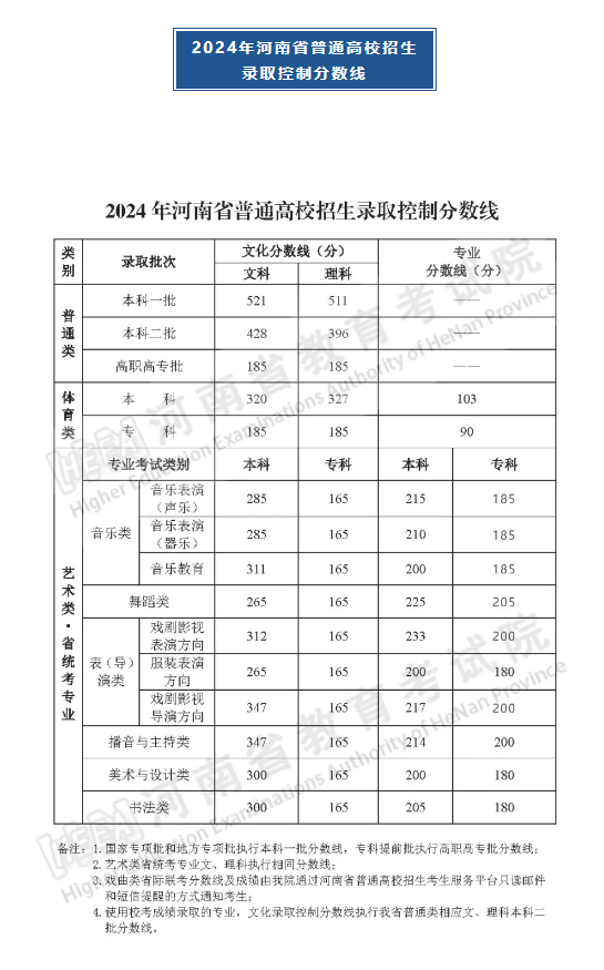 2024年河南省普通高校招生录取控制分数线。图/河南省教育考试院