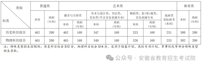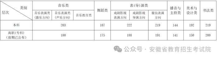 安徽省2024年普通高校招生艺术类统考批次专业课录取控制分数线
