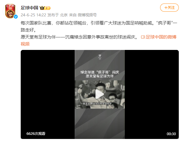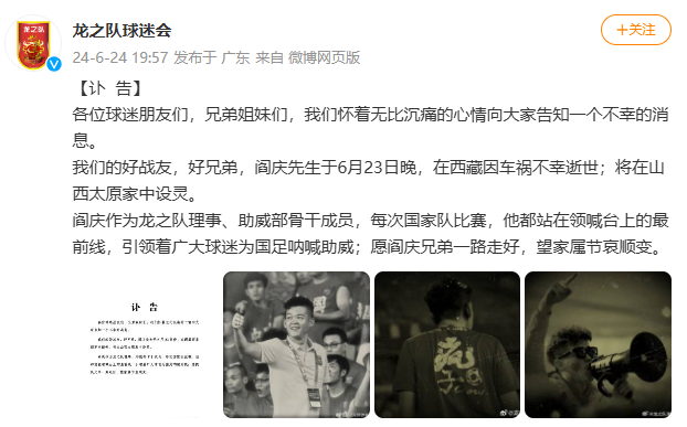 6月24日,中国龙之队球迷会官方账号发布讣告称,龙之队理事、助威部骨干成员阎庆于6月23日晚,在西藏因车祸不幸逝世。随后,中国足协赛事内容官方账号“足球中国”也发文和视频悼念他。
