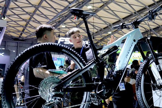 2024年5月5日,第32届中国国际自行车展览会在上海新国际博览中心开幕,参观者在凤凰自行车展台上一辆电助力自行车旁交流讨论。新华社记者 方喆 摄