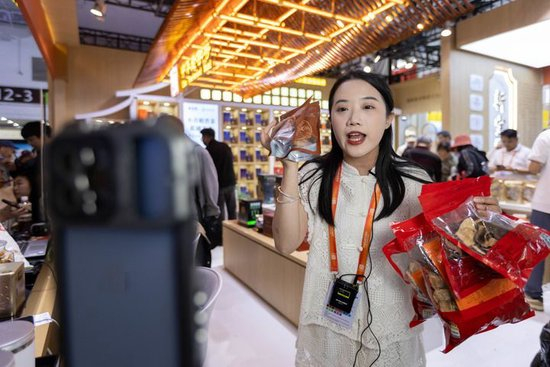 2024年5月13日,在上海举办的中国品牌博览会上,一名工作人员在中华老字号“新宝堂”展位直播带货。新华社记者 王翔 摄