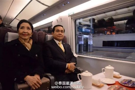 当天上午,巴育在北京南站搭乘京津城际列车,随行的有他的夫人和多位政府官员。巴育和夫人在车厢坐定后,中方的工作人员向他介绍了中国铁路建设、运营和安全保障状况。列车时速达到306公里时,中方陪同人员邀请巴育看显示屏。“丝毫没有感觉,以为还挺慢,结果已经很快了。”巴育说,“我喜欢很快的速度。”