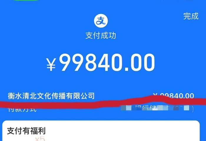 令孔健困惑的是,他根据“李俊浩”微信出示的付款码缴费时,图片界面显示为“衡水中学天津班”,收款单位却不是学校,而是“衡⽔市清北⽂化传播有限公司”。他扫码时发现,在上述费用表的基础上,还要再加收8000元。