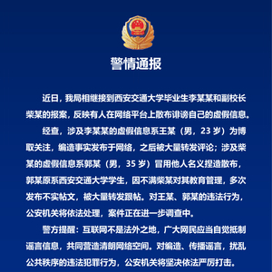 新京报讯 7月5日晚,西安市公安局西咸新区分局通报,近日相继接到西安交通大学毕业生李某某和副校长柴某的报案,反映有人在网络平台上散布诽谤自己的虚假信息。经查,相关信息系两男子分别编造散布,将依法处理,案件正在进一步调查中。