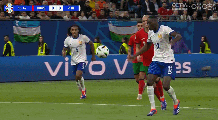 不过法国队迅速给出回应,他们依旧通过熟悉的反击制造杀机,孔德的传球给穆阿尼创造了单刀的机会。但是如同卡塔尔世界杯决赛错失良机一样,这一次穆阿尼的射门则是被回防的鲁本·迪亚兹滑铲解围!随后,卡马文加在小禁区右侧的兜射和登贝莱的远射都偏出球门,连续错过改写比分的机会。在此期间,格列兹曼被登贝莱替换下场,法国队开始全面贯彻两个边路进攻的战术思路。